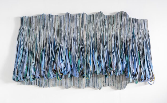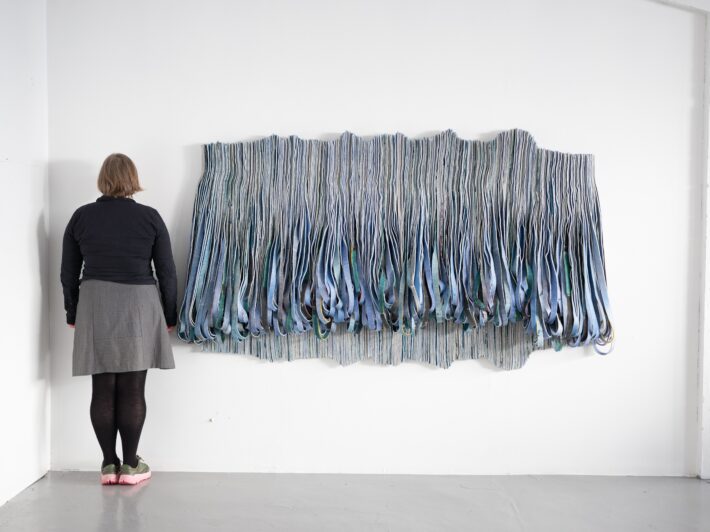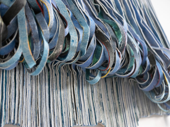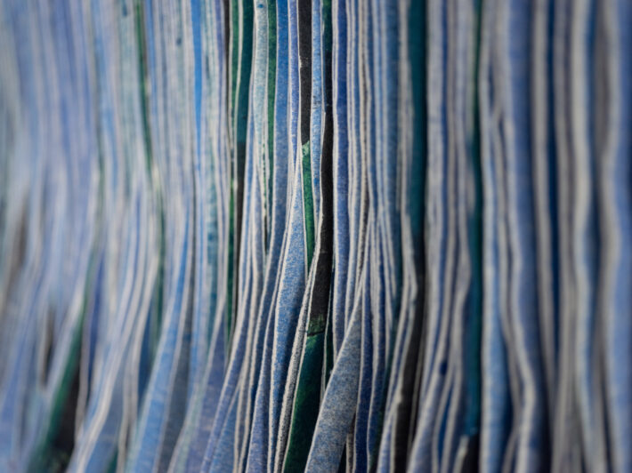 Farget og strimlet ullfilt montert på plate.